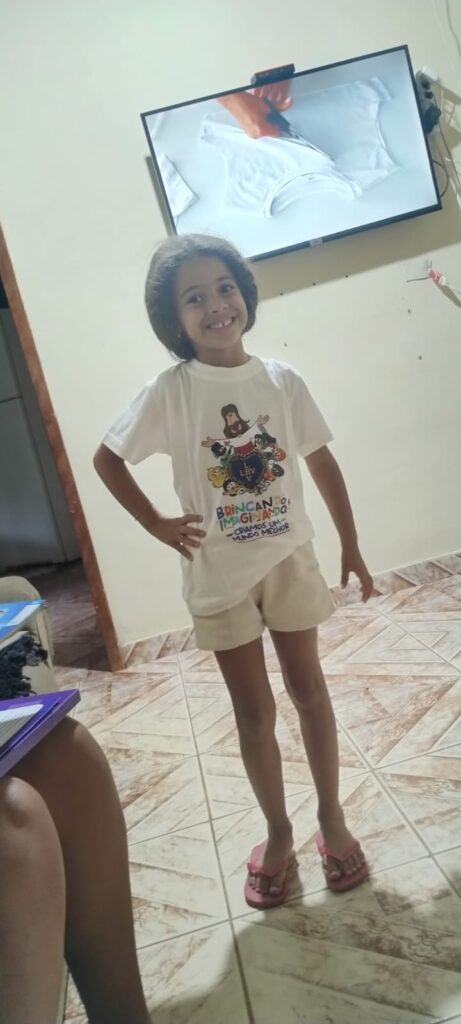 Contagiante a alegria da pequenina ao receber sua camiseta do 23º Fórum Internacional dos Soldadinhos de Deus, que, em 2026, teve por tema “Brincando e imaginando, criamos um mundo melhor”.