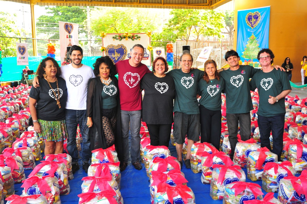 Eliel Brum, ao centro, de vermelho, durante a entrega de cestas de alimentos a famílias atendidas pela LBV
