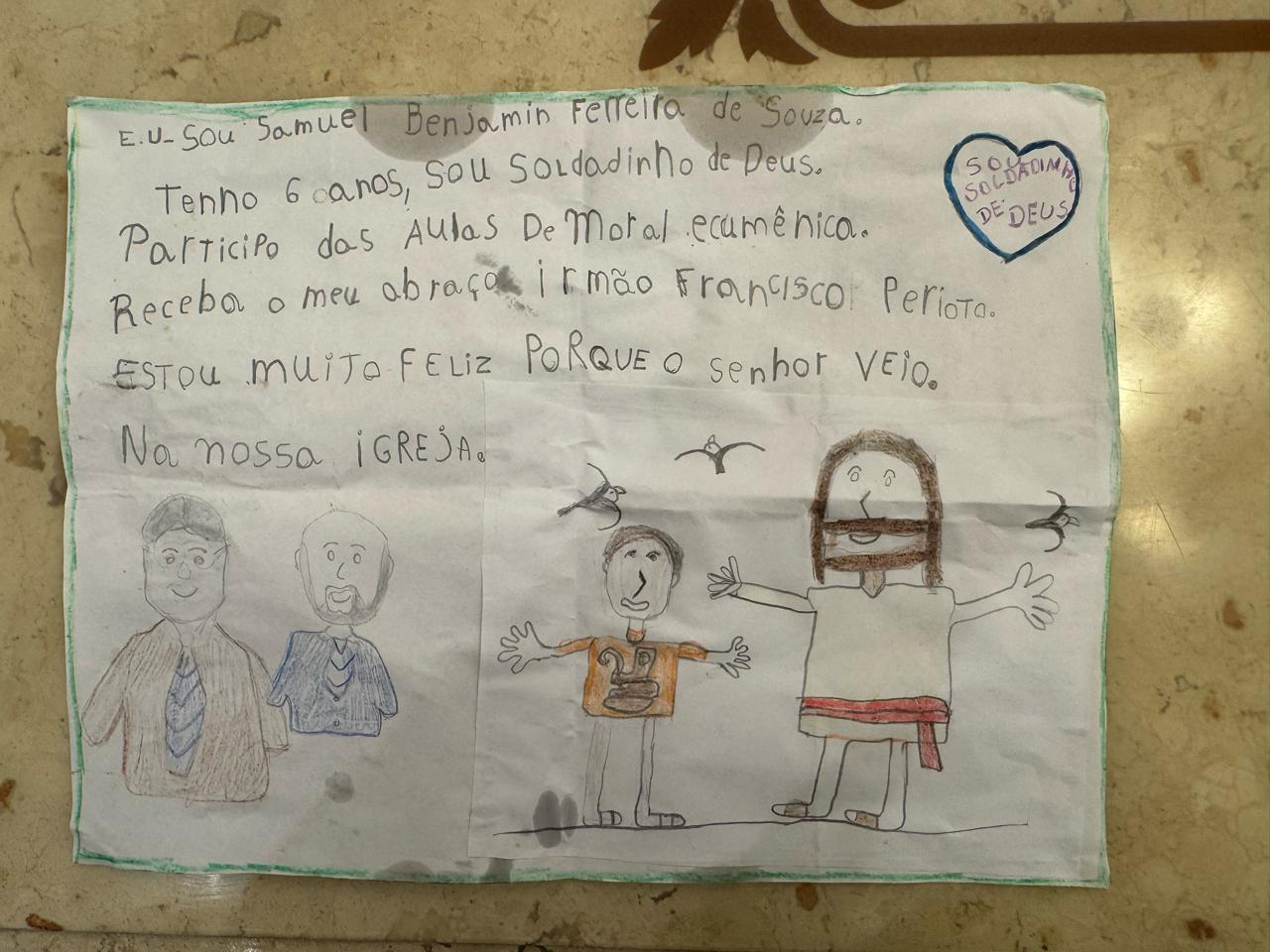 Samuel Benjamin Ferreira de Souza, Soldadinho de Deus, da LBV, de 6 anos, de Santa Rita do Sapucaí/MG, muito feliz com a visita do Presidente da Religião Divina em sua cidade, fez um belo desenho do Irmão Paiva e do Irmão Francisco Periotto (à esquerda) e dele próprio com Jesus (à direita).