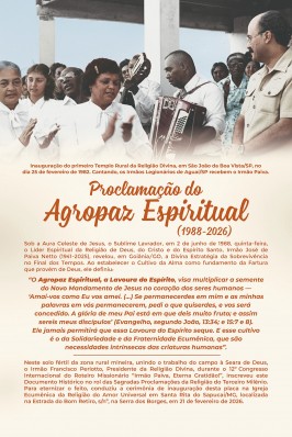 E em sua mensagem de 2 de Junho de 1988, em Goiás (8 anos após lançar os fundamentos do Agropaz), Paiva Netto explicou sobre o Agropaz Espiritual, chamando-nos para a “Lavoura Maior de Nosso Senhor Jesus Cristo”. As forças destas palavras foram seladas no rol das Proclamações da Religião do Terceiro Milênio.