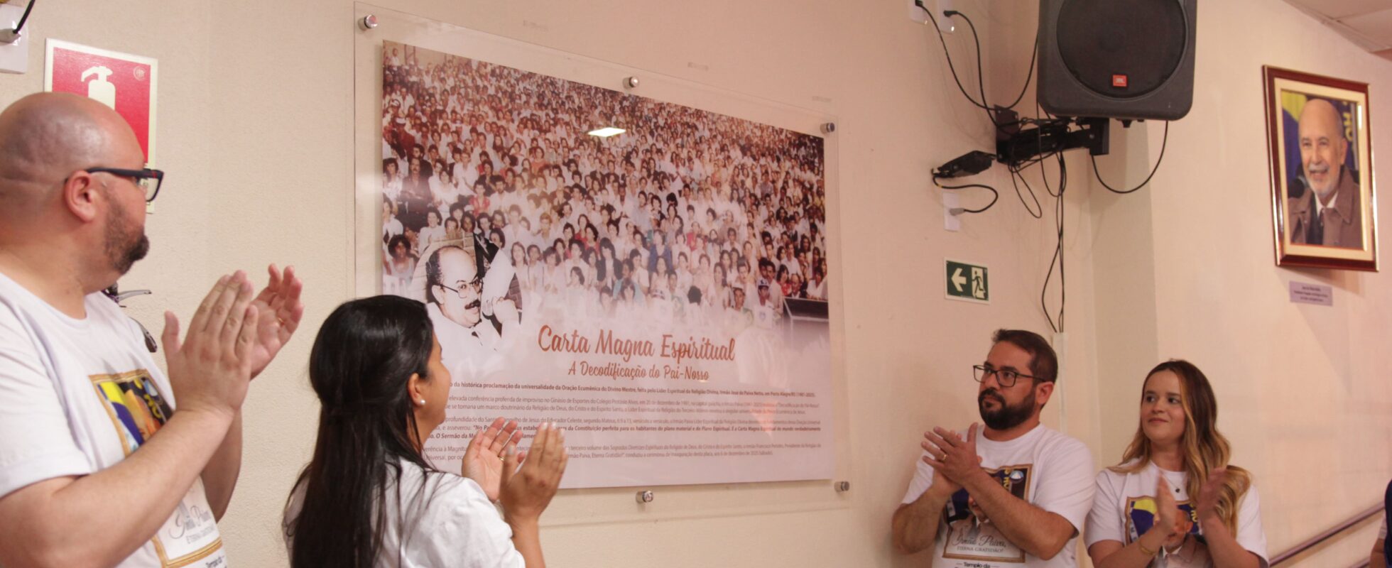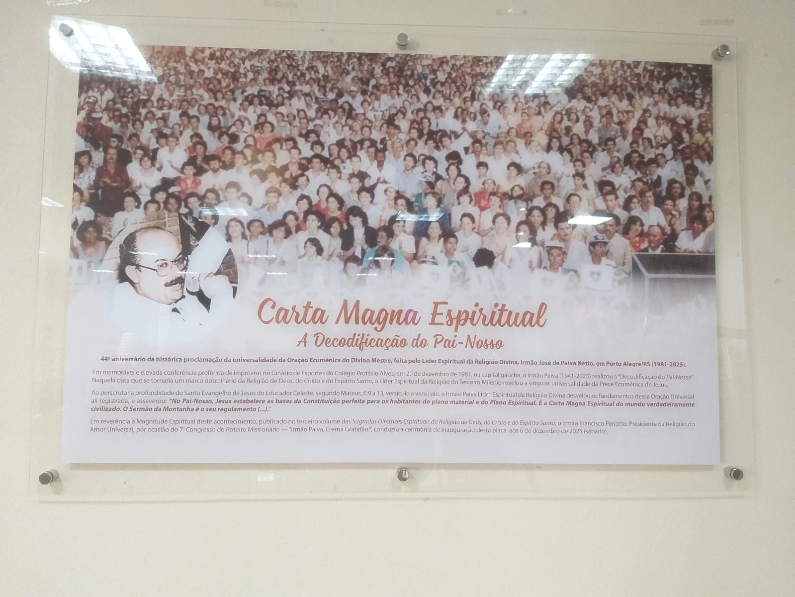 Durante a programação especial na Igreja Ecumênica de Porto Alegre, RS, foi inaugurada uma placa em celebração ao 44º aniversário da decodificação do Pai-Nosso, realizada pelo Irmão Paiva durante uma conferência de improviso em terras gaúchas, no dia 20 de dezembro de 1981. Naquela ocasião, o Líder Espiritual da Religião do Terceiro Milênio analisou detalhadamente cada versículo da oração ecumênica ensinada por Jesus, revelando a profundidade celeste e o caráter universal dessa prece. A respeito dela, disse o Irmão Paiva: “No Pai-Nosso, Jesus estabelece as bases da Constituição perfeita para homens e povos do plano material e do Plano Espiritual. É a Carta Magna do mundo verdadeiramente civilizado”. Um roteiro de Fraternidade e Paz para a humanidade, tanto no mundo material quanto no espiritual.