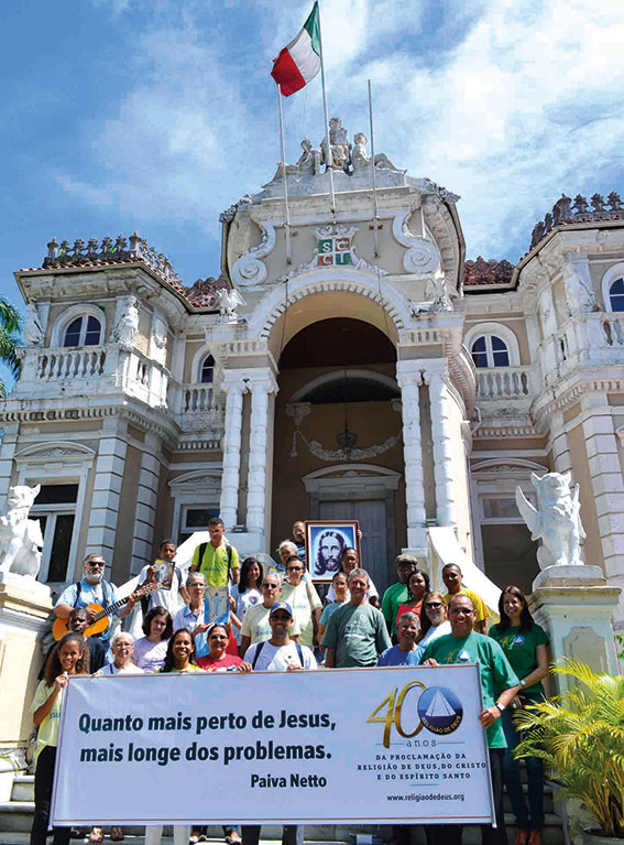 Em foto atual, Jovens Legionários de Salvador, BA, divulgam a mensagem ecumênica da Religião Divina diante da Casa D’Itália, local onde Paiva Netto fez a Proclamação Jesus Vive!. (foto Nizete Souza)