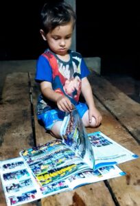 Na cidade de Monte Castelo/PR, o casal Cristão do Novo Mandamento Verania Camargo dos Santos e Clécio Batilani Saraiva e o filhinho deles, Kaleo Camargo Saraiva, 2 anos, também receberam o Irmão José Roberto, que presenteou a todos com exemplares da revista JESUS ESTÁ CHEGANDO!. O Soldadinho de Deus pegou uma das publicações e começou a passar as páginas. Quando os olhinhos dele encontraram a seção infantil da revista ele se encantou e passou a observar com atenção ainda maior.